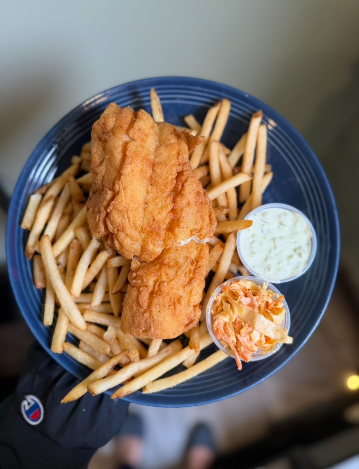three tacos filled with crispy fried fish, cilantro, spicy slaw, drizzled with chipotle aioli