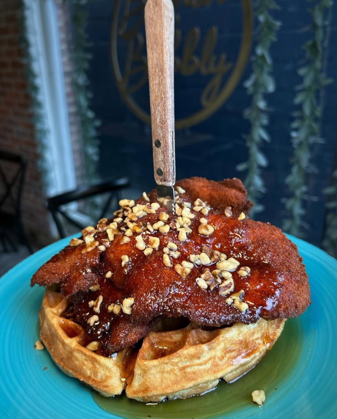 boneless fried chicken breast, walnuts, walnut maple whipped butter, waffle