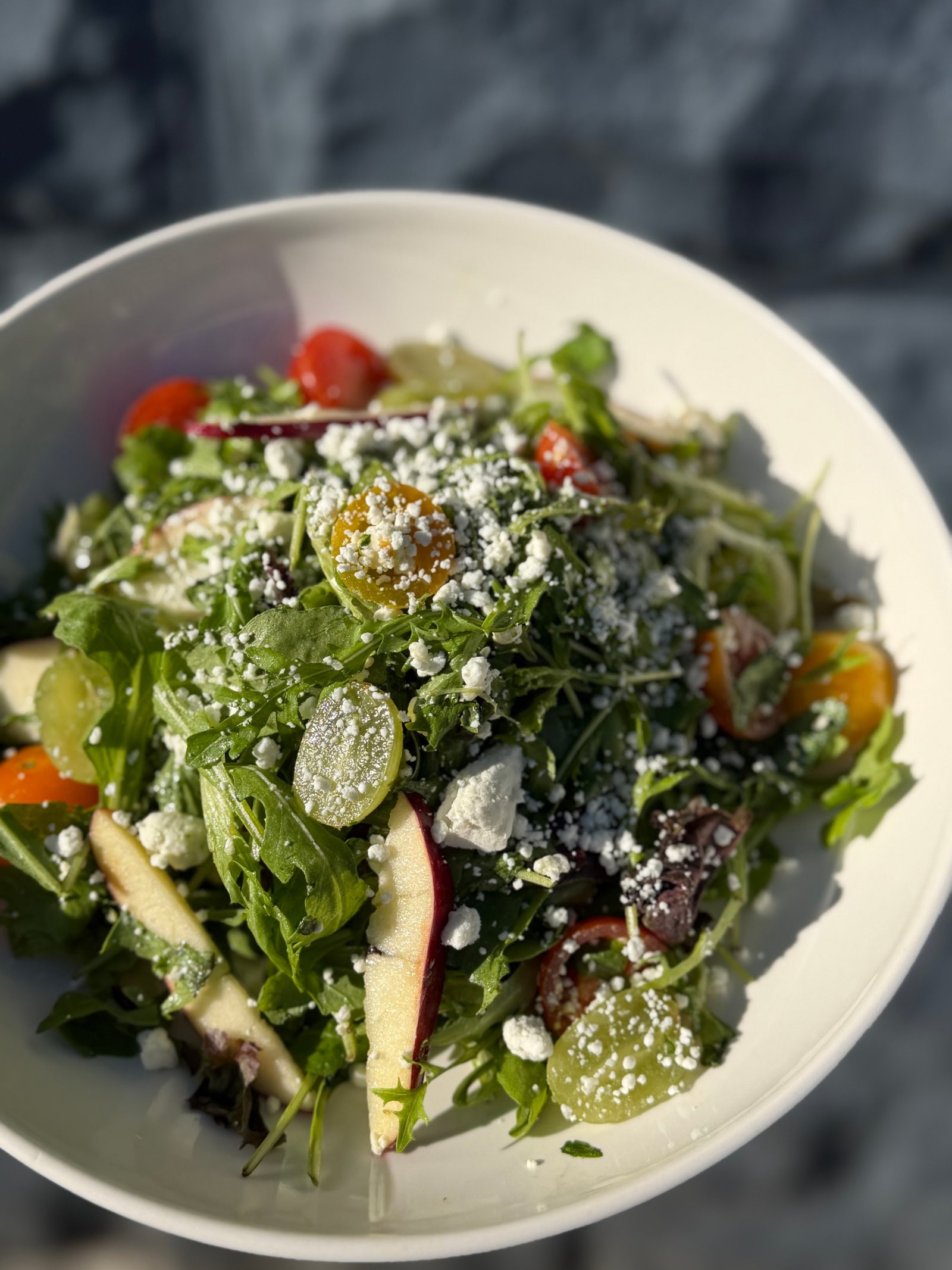 tomato, toasted chickpeas, cucumber, greens, goat cheese, homemade citrus vinaigrette, toasted crostini