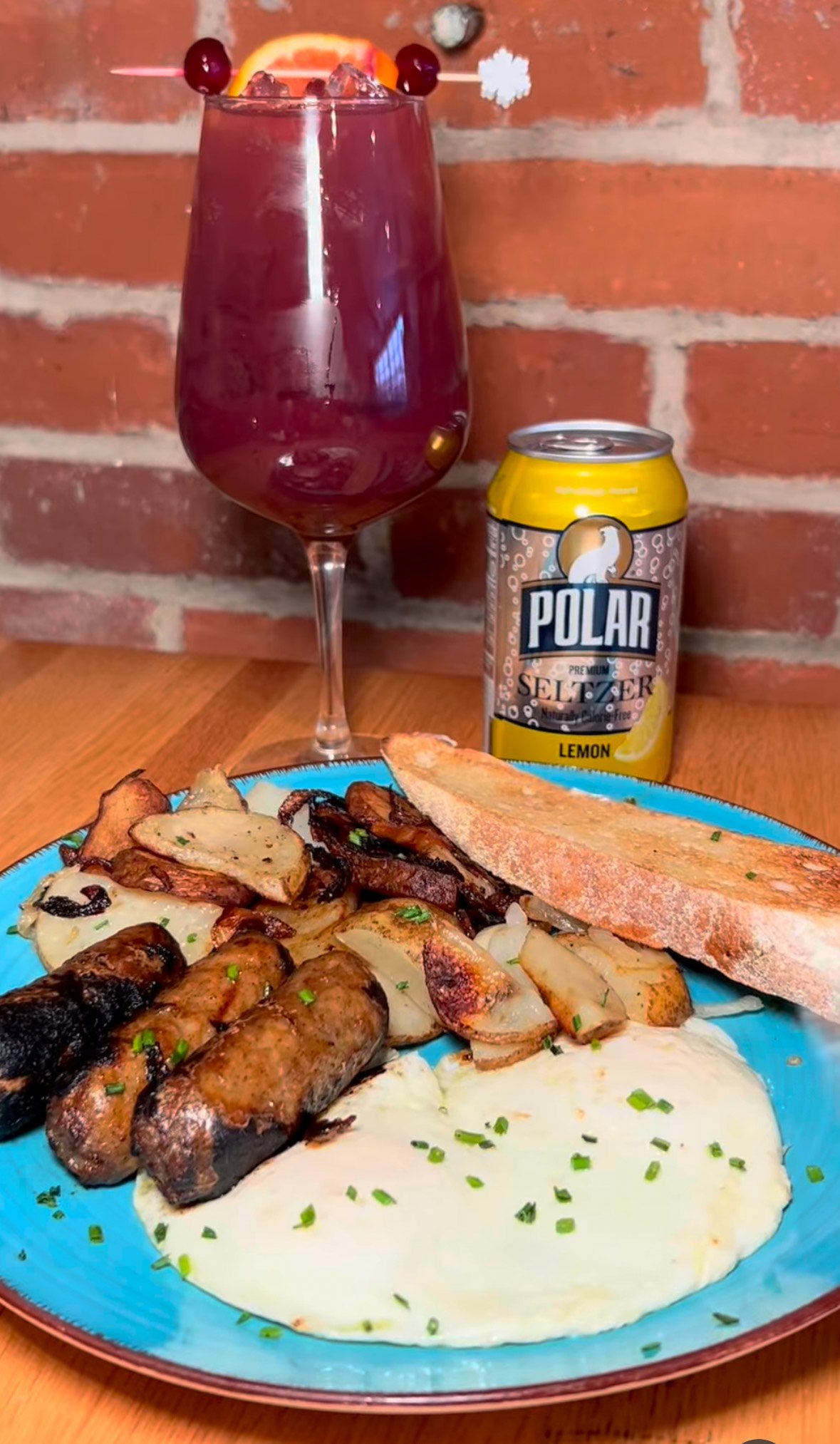 hand-cut fries, kielbasa, tomato, chives, and diced onion topped with fresh parmesan cheese, hollandaise, and two sunnyside eggs