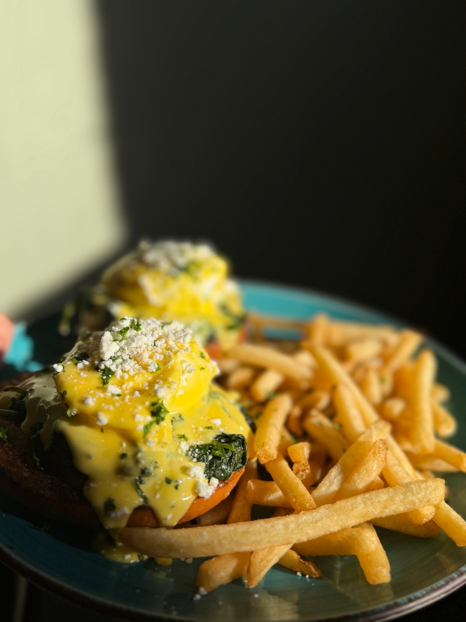 poached eggs, spinach, tomato, goat cheese, brioche, hollandaise, served with lyonnaise potatoes