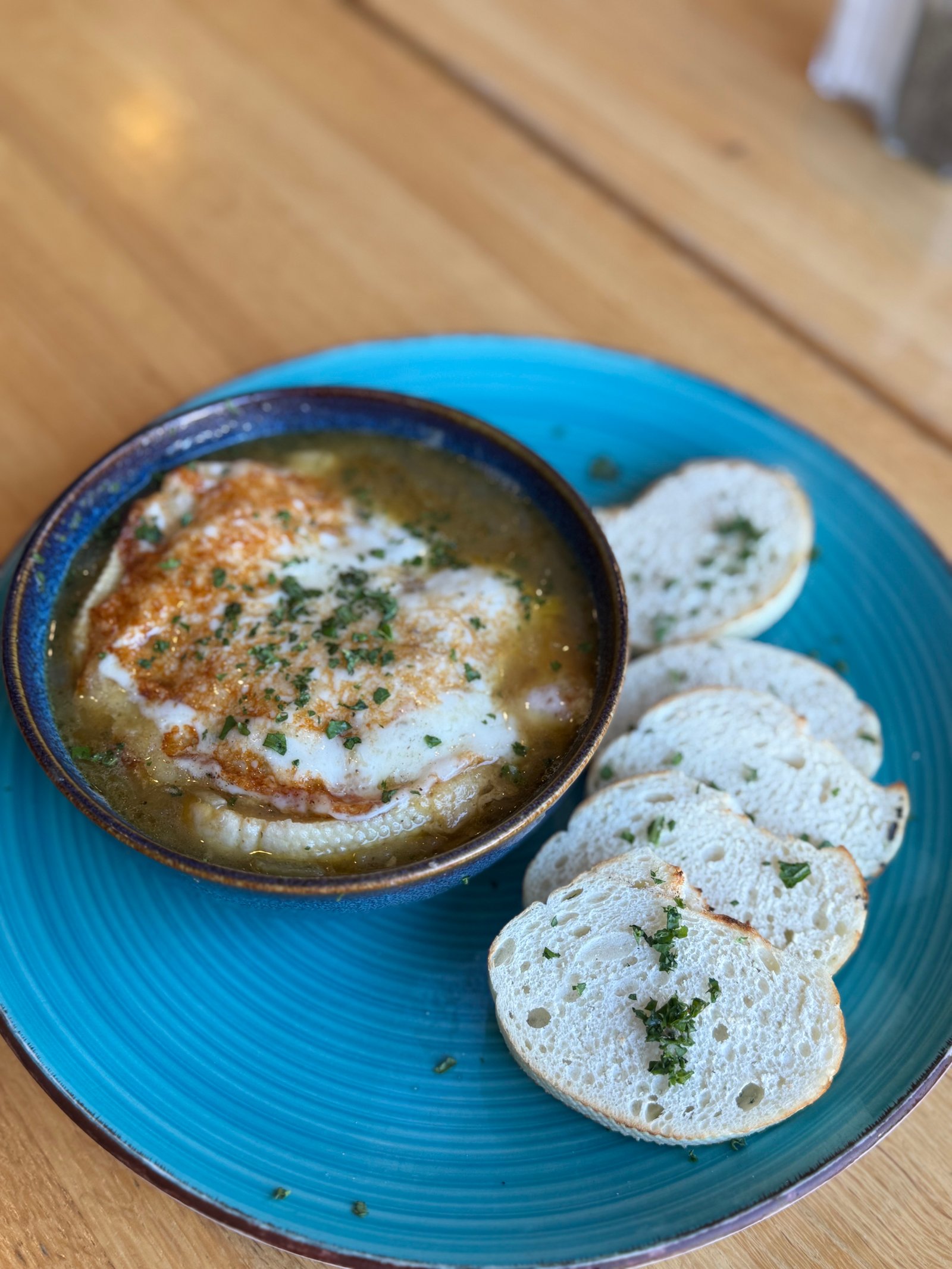 slow caramelized onions, leek, cognac, crouton, gruyère cheese