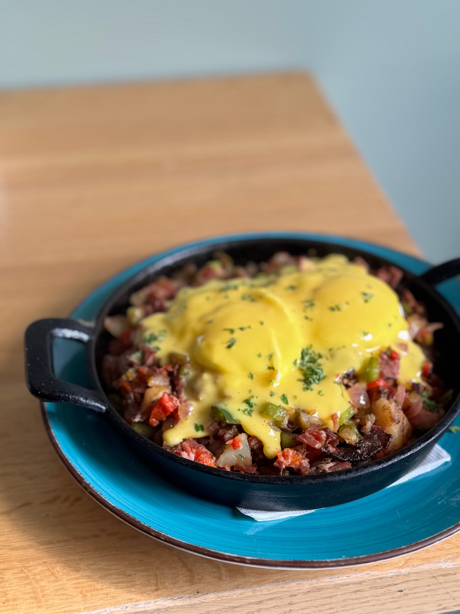corned beef, caramelized onion, roasted red pepper, and lyonnaise potatoes topped with two poached eggs and homemade dijon hollandaise