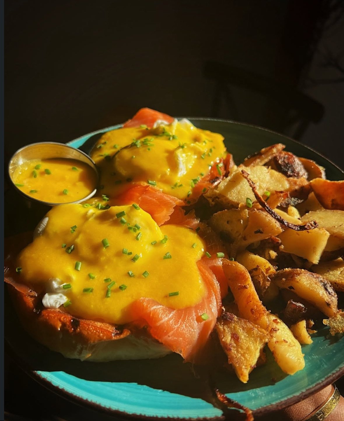 poached eggs, smoked salmon, brioche, hollandaise, served with lyonnaise potatoes