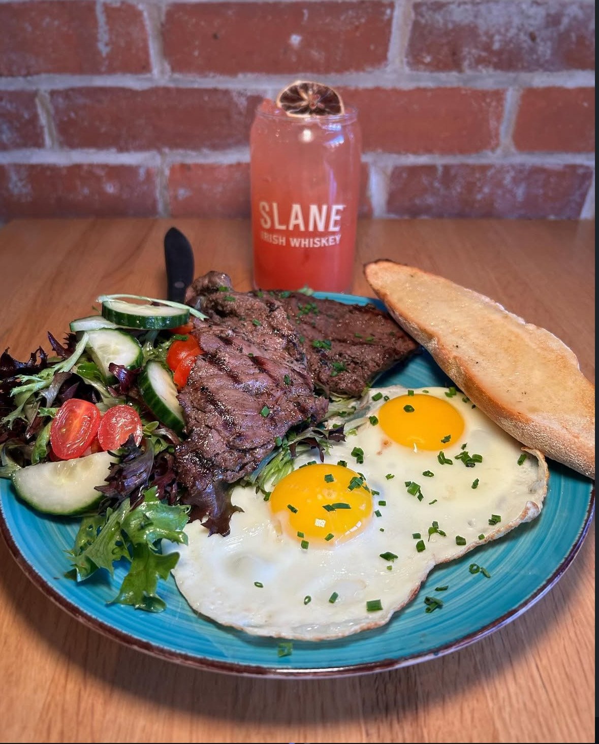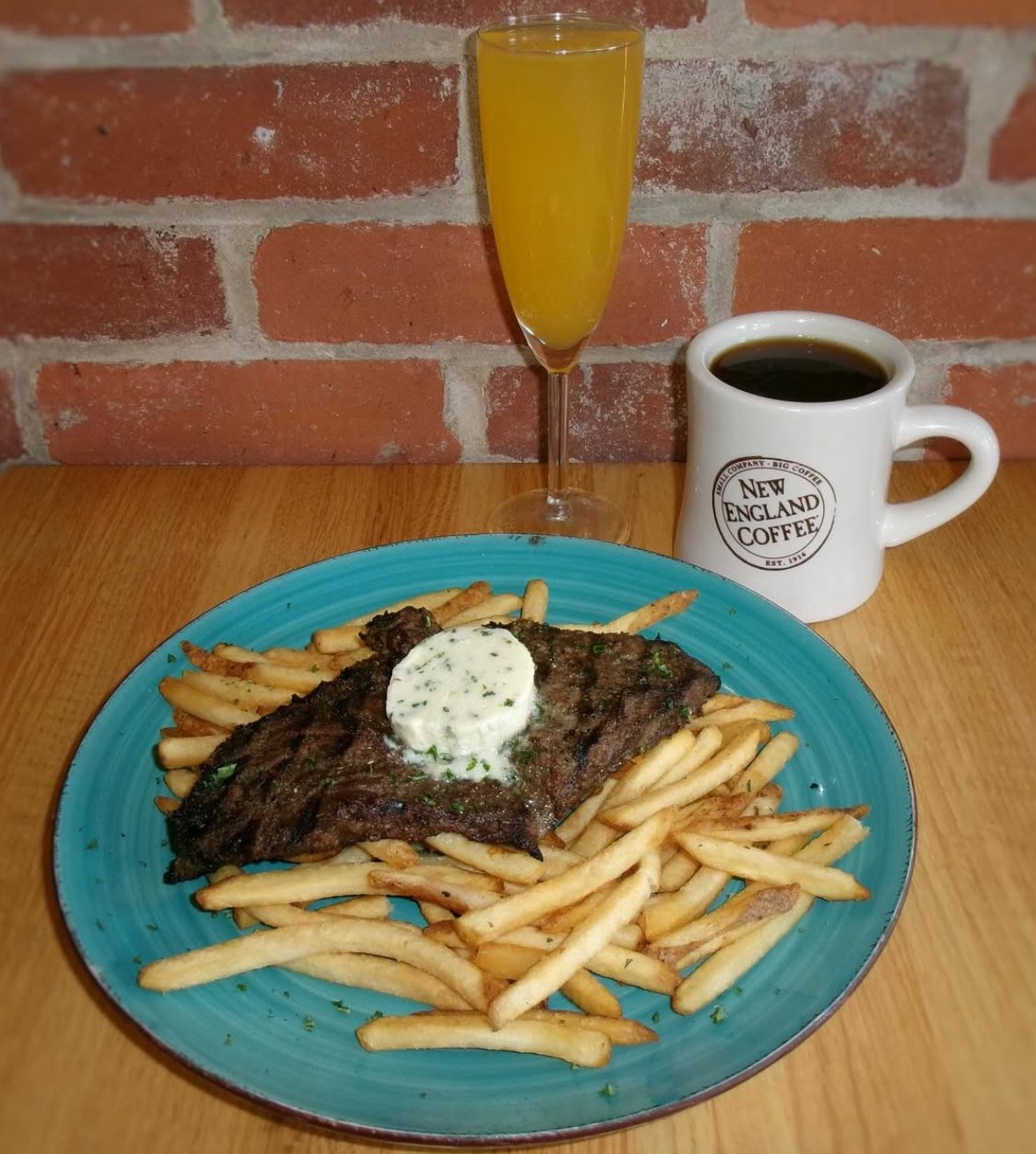 two eggs your way, grilled flat iron steak, lyonnaise potatoes, and a french baguette